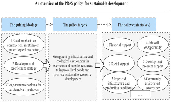 The implement of China’s the PreS policy further supports livelihood recovery and sustainable development of resettled people to some extent. Through the implementation of industrial development projects for resettlers, professionals from all walks of life have been attracted to return to their hometowns to start their own businesses and provide low interest loans, improving the opportunities for resettlers’ collective economy and personal annual income growth through employment and entrepreneurial skills training or education training, resettlers’ livelihoods have been inspired with confidence to become better and personal values have been enhanced through the construction of modern houses, the happiness and perception of access to livelihoods is enhanced, enabling resettlers to gradually adapt to life after relocation, and enhancing the resilience and sustainability of livelihoods. The main overview of the PReS policy for reservoir resettlers is shown in Figure 1.
