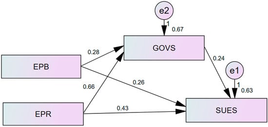 Each determined variable underwent independent testing to ensure that the proposed research model adheres to the previously stated assumptions. The outcome variable, sustainable entrepreneurship, was positively and significantly impacted by the predictor variables entrepreneur’s perceived barrier (EPB) and entrepreneur’s perceived risk (EPR), with a p-value of 0.000. Furthermore, the mediator variable, government support (GOVS), with a p-value of 0.000, significantly and positively influenced the dependent variable, sustainable entrepreneurship (SUES). This shows that the variances in the study variables across all dimensions are not entirely different. Therefore, government support (GOVS) is more likely to positively and significantly affect sustainable entrepreneurship (SUES), as shown in Table 3 below.