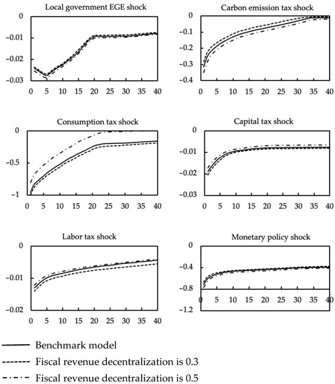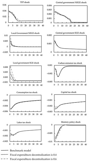 Figure 4 shows the impulse response of exogenous shocks and fiscal revenue decentralization on environmental pollution. It can be found that TFP shock and local government NEGE shock, the increase in fiscal revenue decentralization has further intensified the environmental pollution. With the increased fiscal revenue decentralization, the impact of the increase in central government NEGE on environmental pollution will be weakened. The effect of central government EGE shock, carbon emission tax, consumption tax, capital tax, labor tax, and nominal interest rate shock will further enhance the degree of environmental pollution with the increase in fiscal revenue decentralization.