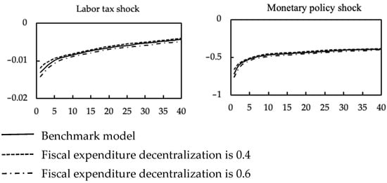 For technology shock, local government NEGE shock, and local government EGE shock, the increase in fiscal expenditure decentralization strengthens the positive effect of these three shocks on the output. However, the increase in fiscal expenditure decentralization inhibits the positive effects of central government NEGE and EGE shocks on the output. The negative impact of carbon emission tax shock, consumption tax shock, capital tax shock, labor tax shock, and nominal interest rate shock on the output will further increase with fiscal expenditure decentralization.