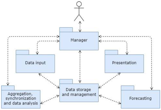 The modules in a forecasting software system automate the main activities (Figure 1). The user of the system accesses the individual modules through a common interface provided by the Manager module. In addition to the connection with the user, it provides management and control over the other modules.