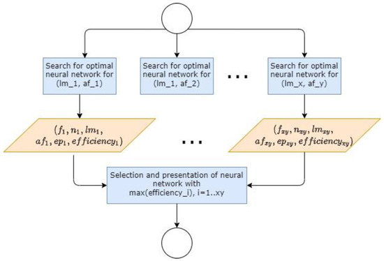 One of our experimented approaches for creating an optimal neural network is iteration over various parameters (Figure 4) needed to create neural networks: number of neurons in the hidden layer, activation functions (Table 1), training algorithms (Table 2), and number of training epochs. It successively changes the parameters for creating neural networks and examines the efficiency of the current neural network. The first neural network that meets the requirements set by the user is considered optimal. Therefore, an important part of the algorithm is how to change the iterative parameters. Since the creation and training of each neural network requires a certain amount of computer resources and time, the iterative approach is appropriate to use on single-processor machines only for tasks where finding the appropriate neural network is expected to have a relatively small number of iterations.