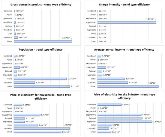 The comparative analysis between the efficiency of the found neural networks in a one-year forecast and the type of trend in time series, leading to minimal error, is presented in Figure 8.