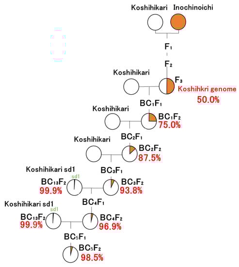 The japonica rice Koshihikari is a leading rice variety in Japan, accounting for 36.1% of the rice acreage in the country. Koshihikari is globally valued and produced in the United States and Australia. However, Koshihikari suffers severe lodging damage due to frequent heavy rains, floods, and strong typhoons; thus, the development of lodging-resistant Koshihikari has been a longstanding challenge. Tomita (2009) introgressed the semidwarf gene sd1 from Jukkoku to Koshihikari by backcrossing to Koshihikari eight times to develop a semidwarf form of Koshihikari, which was approximately 20 cm shorter than Koshihikari [22] and consisted more than 99.8% of the genome of Koshihikari, except for sd1 derived from Jukkoku [23]. This cultivar, named Hikarishinseiki (rice cultivar number 12273) [22,24], is the first cultivar of semidwarf isogenic Koshihikari with sd1 registered in Japan and the USA [25,26].