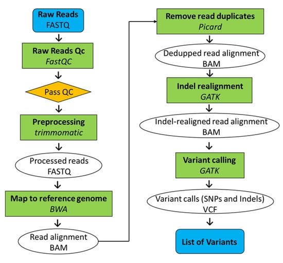 - McKenna, A.; Hanna, M.; Banks, E.; Sivachenko, A.; Cibulskis, K.; Kemytsky, A.; Garimella, K.; Altshuler, D.; Gabriel, S.; Daly, M.; et al. The genome analysis toolkit: A MapReduce framework for analyzing next generation DNA sequencing data. Genome Res. 2010, 20, 1297–1303. [Google Scholar] [CrossRef]