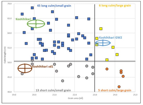 Relationship between grain area and culm length in Koshihikari sd1//Koshihikari × 3/((Koshihikari × Inochinoichi) F3 GW2 type) BC4F2 plants. sd1 homozygous semidwarf plants with a culm length of 41.8–50.5 cm and long-culm plants with a culm length of 50.6–68.6 cm were segregated in a 21:52 ratio (1 sd1sd1:3(1Sd1Sd1 + 2Sd1Sd1) (χ2 = 0.02, 0.85 < p < 0.90)). In addition, among the 21 sd1 homozygous semidwarf plants, GW2 homozygous large-grain plants with a grain area of 22.7–24.4 mm2, heterozygous plants with a grain area of 20.5–22.6 mm2, and gw2 homozygous small-grain plants with a grain area of 19.4–20.4 mm2 segregated in a 5:10:3 ratio (1 GW2GW2:2 GW2gw2:1 gw2gw2 (χ2 = 2.0, 0.35 < p < 0.40)).
