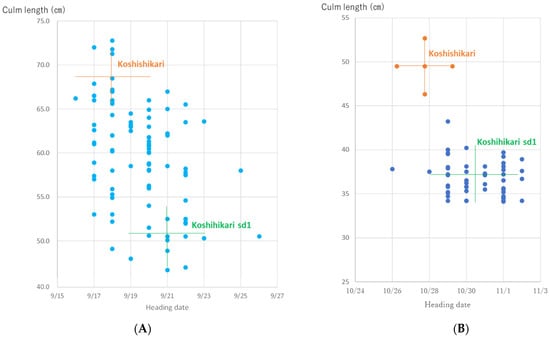 Relationship between ear emergence period and culm length in Koshihikari sd1 × 2//Koshihikari × 3/((Koshihikari × Inochinoichi) F3 GW2 homozygous) BC5 plants. (A) sd1 homozygous with short/thick/dark green flag leaves having a culm length of 42.5–54.9 cm, similar to Koshihikari sd1, the intermediate heterozygous having a culm length of 55.3–63.6 cm, and Sd1 homozygous with long/light-colored flag leaves having a culm length of 64.0–72.0 cm, similar to Koshihikari, were segregated with a theoretical one gene inheritance ratio of 12:22:10 (1 sd1 homozygous:2 Sd1sd1 heterozygous:1 Sd1 homozygous (χ2 = 0.18, 0.90 < p < 0.95)). Regarding grain size, large-grain GW2 homozygous plants with a grain area of 28.2–31.3 cm2, intermediate heterozygotes, and small-grain gw2 homozygous plants with a grain area of 25.2 to 27.8 cm2 were found to segregate in a ratio of 29:43:20 (1 GW2 homozygous:2 GW2gw2 heterozygous:1 gw2 homozygous) and fitted to the theoretical one gene inheritance ratio (χ2 = 4.5, 0.09 < p < 0.10). (B) The culm length of BC5F3 plants ranged from 29.2 to 43.2 cm and was similar to that of Koshihikari sd1, which ranged from 32.5 to 39.2 cm. Therefore, these BC5F3 plants were fixed in sd1 homozygous.