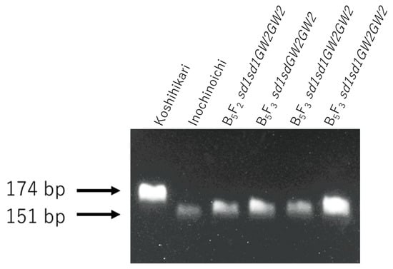 The relationship between the ear emergence period and culm length of the BC5F3 progeny of GW2sd1 homozygous BC5F2 plants (Figure 4A) is shown in Figure 4B. The culm length of BC5F3 plants ranged from 29.2 to 43.2 cm and was similar to that of Koshihikari sd1, which ranged from 32.5 to 39.2 cm (Figure 4B). Therefore, these BC5F3 plants were fixed in an sd1 homozygote. Genetic diagnosis of three arbitrarily selected plants using dCAP markers revealed that all plants were GW2 homozygous type (Figure 5).