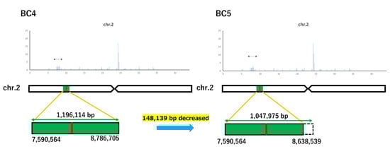 Transitional changes in the size of DNA fragments integrated with GW2 via backcrossing. The size of the DNA fragment integrated with GW2 was determined as the distance between both ends of the SNP cluster. However, through the backcrossing from BC4 to BC6, the size of the DNA fragment integrated with GW2 decreased by 148,139 bp.