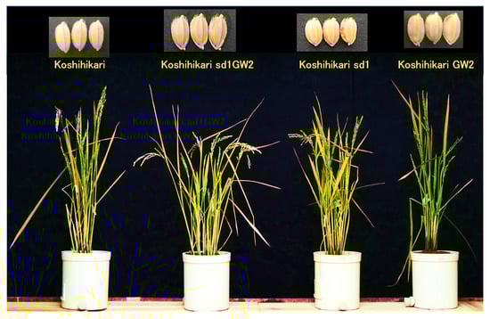 In this regard, we focused on a large-grain variety, “Inochinoichi”, with a thousand-kernel weight of unpolished rice being 1.5 times that of Koshihikari, as a high-yielding genetic source. We identified a single large-grain allele through genotypic segregation in a ratio of one large-grain type to two heterozygous types to one small-grain type via each generation of backcrossing (BC1F2 (the second filial generation in the first backcross; filial means progeny of hybrid) to BC5F2) to a recurrent parent Koshihikari using a large-grain F2 (second filial generation) plant as a non-recurrent parent, which segregated from a cross between Koshihikari and Inochinoichi [27]. Furthermore, the large-grain gene, grain width and weight 2 (GW2), derived from japonica rice, was identified for the first time based on a whole-genome analysis of the developed large-grain Koshihikari-type isogenic line [27]. To contribute towards the “New Green Revolution”, in this study, we developed a large-grain/semidwarf isogenic line “Koshihikari sd1GW2”, which is designated as “the Koshihikari incorporating both the large-grain gene GW2 and the semidwarf gene sd1”. Koshihikari sd1GW2 is a high-yielding rice cultivar with enhanced resistance to lodging.