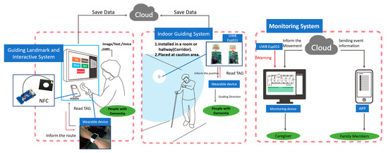 Dementia Elderly Care Management and Guidance Security System, including the Indoor Guidance system, the Guiding Landmark and Interactive system, the Monitoring system, and the user operation diagram [22].