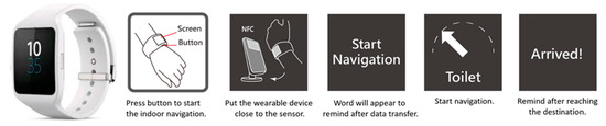 During the guidance process, the patient must wear a device to display the direction. Therefore, the built-in sensing module of the wearer must include a Bluetooth module and a Wi-Fi module as the communication function and the acceleration sensing module as the sensing function during steering. In this study, the Sony Smartwatch 3 was selected as the functional carrier of wearable devices (Figure 2).