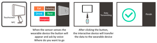The Guiding Landmark system and the interactive device aim to improve the wayfinding ability of residents with dementia in the indoor environment and reduce caregivers’ care burden. The guiding landmark is composed of a touch screen and an NFC sensor. The touch screen is erected on the wall about 150 cm above the ground to facilitate the residents with dementia in operating and viewing the wayfinding information. The erection site is at the turning point of the path in the maintenance institution, the door of the residential room, the toilet, the tea room, the friendship hall, the restaurant, and other frequently used space positions. The screen interface displays daily activities for the patient to choose from (Figure 3). The patient first connects to the NFC with a wearable device. Touching the screen interface will display text and pattern options for eating, drinking, resting, and going to the toilet, and asking “what do you want to do” by voice. After the patient uses a voice or touch pattern to choose an activity, the guiding landmark will transmit the value to the wearer and guide him to the destination. The wearable device will sense the UWB anchor signal when the patient arrives at the destination (Figure 4). When the signal meets the destination, the smartwatch will terminate the guidance and display the word “arrival”. When the smartwatch completes an operation, the system will use Wi-Fi as the transmission medium to back up the interactive records and the operation time in the cloud for the monitoring system to view the data. The smartwatch then returns to its initial state.