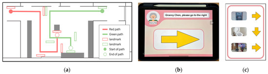 Many studies have aimed to improve or address the cognitive impairment of patients with dementia. Most were aimed at the method of identifying and making decisions on the patient’s travel path. Liu et al. [24] used PDA to navigate patients with cognitive impairment, and they found that text display was more efficient than images. If words were combined with sound prompts, the efficiency of guidance was improved. Reagan and Baldwin [25] believed that rotating the sound, distance, orientation, and image would improve the accuracy of the guidance and reduce the reaction time. If the entity landmark image was combined with the direction indicator, the error rate was the lowest, and the platform was easy to use [26]. In addition, if landmarks were presented with meaningful and familiar objects [27], the probability of patients returning by themselves was improved. Grierson et al. [28] used the belt as a guiding tool. Most patients with dementia could turn correctly according to the belt. However, if the amount of navigation information was simplified, it can effectively improve the accuracy of patients’ wayfinding. Qianzhongyi [29] found that the accuracy of patient-centered navigation was the same as that of normal subjects. Still, if the floor was changed (stairs or elevators), it was easy for the patient to become lost.