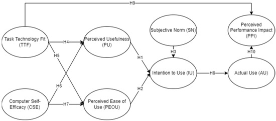 Task Technology Fit (TTF) is the measure to which the technology is able to support the individual in turning inputs into outputs [45]. The fitness of the function of technology with the requirements of the task determines its usefulness [39]. In the context of this study, TTF is the degree to which the individual believes that the tool he/she is using is fit to the job portfolio. Past findings have shown that TTF has a significant effect on PU and PEOU [25,28,38,49]. In addition, several studies have stated that when users are satisfied with the system usage due to PU and PEU, they would have a higher intention to use the system [50,51,52]. It could be stated that the influence of fit of the system for the intention to use would be inclined on the perspective of users with its usefulness and ease of use. For this construct, we have the following hypotheses: