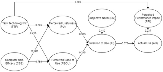 The associations between the constructs of the final model were evaluated based on the measure of statistical significance (p-value < 0.05) and their standardized loadings. Table 9 presents the direct, indirect, and total effects of latent variables. For the direct effects, Subjective Norm had a higher positive effect on Intention to Use (β = 0.604, p = 0.002) than Perceived Ease of Use (β = 0.268, p = 0.050). Task Technology Fit has a higher positive effect on Perceived Usefulness (β = 0.826, p = 0.002) than its effect on Perceived Performance Impact (β = 0.810, p = 0.003). Actual Use has a positive direct effect on Perceived Performance Impact at 0.194 with a significance of 0.016. The direct path of Computer Self-efficacy to Perceived Ease of Use has the highest loading in the model (β = 0.849, p = 0.002). This indicates that Hypothesis 2, PEOU on IU is accepted; similarly, Hypotheses 3, 4, 7, 8, 9, and 10 were also accepted; while hypothesis 1 was not. Summarized in Table 9 are the accepted hypotheses, beta coefficients, and p-values.