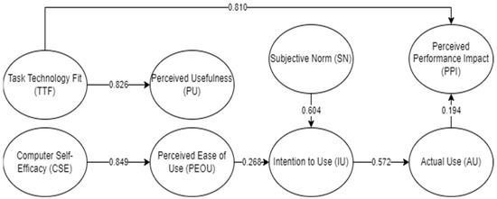 Figure 4 presents the initial model of the study. All paths were found to be significant with a p-value less than 0.05 [66]. Unfortunately, based on the assessment of the proposed framework’s fit with the data gathered, removing paths PU → IU, TTF → PEOU, and CSE → PU (p-values close to 0.05) would improve the adequacy of model fit following the suggestion of Hair [66]. To have an acceptable proposed model, the mentioned relationships which are close to having p-value = 0.05 were removed. As seen in Figure 2, the relationship has values indicating the beta coefficient. This pertains to the strength and sensitivity among all direct relationships in the model. TTF has the highest and strongest relationship on PPI, followed by TTF on PU, CSE on PEOU, and the rest in sequential and descending order. Following this is Table 3 with the model modification results.