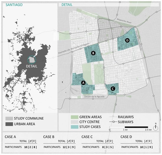 The participants were recruited through local gatekeepers (i.e., community leaders, public servants working in the neighbourhoods) who provided the contact details of older persons interested in collaborating. Following a snowball scheme [73], these older persons were contacted, interviewed (if agreed) and later asked for the contact details of acquaintances who would be interested in the research. Forty older persons agreed to participate; they ranged between sixty and ninety years old, were mostly women (thirty-one female participants and nine male participants) and were residents of four neighbourhoods of the centre of Santiago de Chile that have distinctive trajectories, predominant building types and land use patterns (Figure 1). In detail: