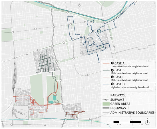 In addition to the analysis of the conversations described earlier, the routes followed by the participants and the places pointed out as significant (e.g., the damaged section of a sidewalk, dangerous street crossing and well-kept green area) were recorded with GPS devices and, later, drawn on maps. To complement the data, the physical features of neighbourhoods, including the characteristics of buildings (typologies, uses and heights), sidewalks (width, conditions) and crossings (kerb cuts, pavement markings and traffic lights), were registered on-site, digitalised with the assistance of computer-aided design and drafting software (i.e., AutoCAD, SketchUp) and employed to build maps of the cases and three-dimensional representations of significative streets.