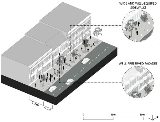 The accumulation of rubbish, pet waste and debris on the streets and the absence or destruction of urban furniture also worsen older persons’ walking experience. As other authors have shown [59], these conditions of the built environment were depicted as meaningful issues and thoroughly described as signs of absent institutions and the presence in the community of groups and individuals that do not care about the common good. The participants suggested that walking through dirty and neglected streets is unpleasant. It prompts negative emotions (e.g., frustration, sadness), strengthens older persons’ sensation of being powerless agents with little support from others to change what seems wrong and decreases their willingness to be outside and engage with the community. Figure 4 illustrates the opposite case, a street located in Case B that was described as “engaging” because it has wide and equipped sidewalks and is flanked by the facades of well-preserved historical buildings.