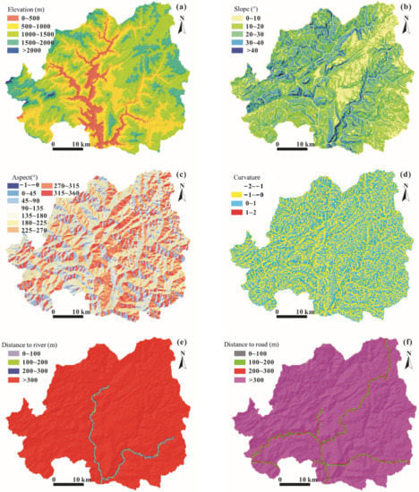 | Elevation (m) | 0~500 | −0.4085 | 22 | Distance to river (m) | 200~300 | 0.593 | 4 |