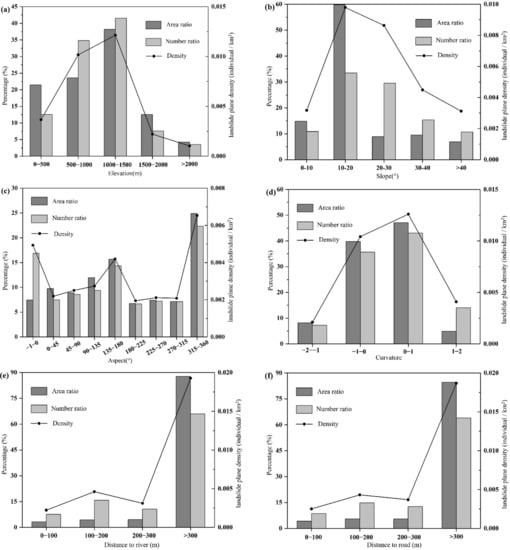 - Slope (Figure 3b) is also an important factor in landslide, which will affect surface water runoff and slope vegetation. The slope of the study area was extracted to obtain the range of 0~53°, which was divided into five grades of 0~10°, 10~20°, 20~30°, 30~40°, and >40°, and the development of landslide disasters in each grade was counted. It can be seen that the landslide disasters in the region basically occur on the slope below 30°, and the number and density of landslides are large in the range of 10~20°. The reason for this may be that the area with small slope is easily affected by human engineering activities and is not conducive to slope drainage under rainfall conditions. Rainwater aggravates the quality of rock and soil and has a softening effect on rock and soil, reduces its shear strength, and easily leads to landslide disasters. At the same time, this range of slope area accounted for a larger percentage.