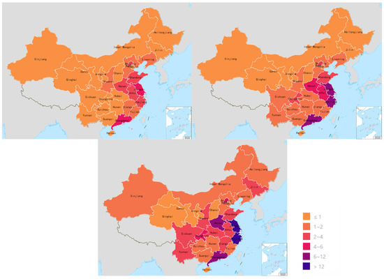 Figure 1 depicts external demand emissions, and it shows that the embodied carbon inflow in Shanghai experienced an upward trend from 2012 to 2017. Further yearly analysis shows that Jiangsu, Zhejiang, and Guangdong provinces near Shanghai have the largest inflow of embodied carbon, 15.76, 14.56, and 10.76 million tons, respectively, accounting for 42% of the total outflow in 2017. Henan and Anhui, which are closer to Shanghai, and Beijing and Chongqing, which are more economically developed, also have higher embodied carbon inflows than Shanghai. However, the inflow of embodied carbon in Qinghai, Gansu, Ningxia, and other western regions was low for those three years, indicating low trade with Shanghai. Due to a lack of data in CEADS, the embodied carbon flowing into Tibet is vacant, and it is shown as transparent in Figure 1.