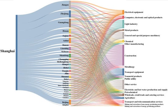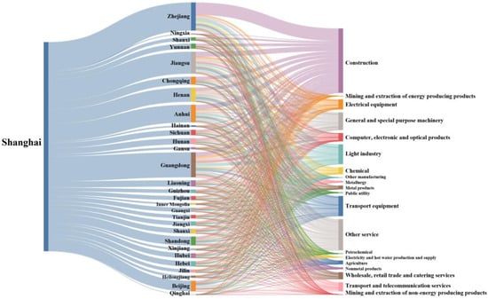 According to Figure 2, depicting Shanghai production-side embodied carbon emissions, we can analyze the dimensions of Shanghai’s production-side external demand-embodied carbon emissions flowing into different provinces and, eventually, into sectors. The Sankey diagram shows that, in 2012, the largest amount of embodied carbon flowed into construction, as high as 11.79 million tons. Other services and light industry rank second and third, with 5.42 and 4.58 million tons, respectively. These three sectors accounted for 51.8% of the external demand-embodied carbon emissions on Shanghai’s production side. Mining and the extraction of non-energy- and energy-producing products had the least embodied carbon emission inflow, with only 110,000 tons of carbon emissions. It accounted for 0.3% of the external demand carbon emissions on Shanghai’s production side, indicating that Shanghai is scarce in natural resources. The embodied carbon emission inflows of public utility, other manufacturing, and electricity and hot water production and supply are also considerably small and have not reached 200,000 tons of carbon emissions.