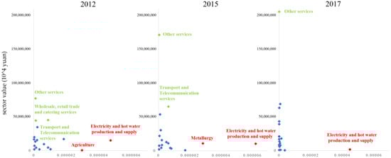 We took the sector value, qi, and the sector emission carbon intensity, ci/qi, as variables to draw a scatter diagram, as shown in Figure 5. The vertical axis represents the sector value, and the horizontal axis represents the sector’s carbon emission intensity. It is clear that there are three characteristic sectors: high production-side value with low embodied carbon intensity, low production-side value with high embodied carbon intensity, and low production-side value with low embodied carbon intensity. In Figure 5, they are indicated in green, red, and blue, with corresponding sector labels. In Shanghai, we identified sectors with high production-side value and low embodied carbon intensity: other services, transport and telecommunication services, wholesale, retail, and catering services. These are mainly concentrated in the service industry, indicating that the service industry brings high benefits with relatively low carbon emissions, which should be vigorously developed. We also identified sectors with low values on the production side and high carbon intensity in the following sectors: electricity and hot water production and supply, agriculture, and metallurgy. Although these sectors have low values because they have high emission intensity, clean energy should be used to reduce carbon emissions. Meanwhile, it can be observed that, from 2012 to 2017, most of the sectors in Shanghai have an obvious trend of contraction to the coordinate origin. This coincides with the downward trend in carbon emissions of domestic demand (the embodied carbon produced in Shanghai and eventually flowing into Shanghai), which indicates that the carbon intensity of the departments in Shanghai is decreasing.