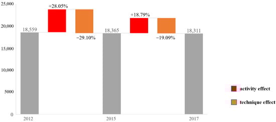 From an overall view of the effect of carbon emission drivers on the production side of Shanghai, the activity effect is the primary driver of embodied carbon increase, and the technique effect is the primary driver of embodied carbon reduction (Figure 6). From 2012 to 2015, the contribution of the activity effect to the embodied carbon emissions on Shanghai’s production side was 28.05%, increasing carbon emissions by 52.06 million tons; the contribution of the technique effect was −29.10%, reducing carbon emissions by 54.01 million tons. From 2015 to 2017, the contribution of the activity effect to the embodied carbon emissions on Shanghai’s production side was 18.79%, increasing carbon emissions by 34.51 million tons. The contribution of the technique effect to the same was −19.09%, a 35.06-million-ton reduction.