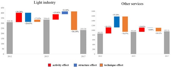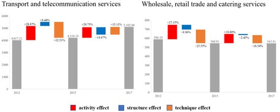 Among these, the sectors with the most apparent activity effects are transport and telecommunication services and wholesale, retail trade, and catering services (Figure 7). Transport and telecommunication services increased by 11.6 million tons of embodied carbon owing to the activity effect in 2012–2015, with a contribution rate of 28.87%, and increased by 8.74 million tons in 2015–2017, with a contribution rate of 20.75%. The carbon emission contribution rates of wholesale, retail trade, and catering services to the increase in the activity effect during 2012–2015 and 2015–2017 were 27.15% and 18.8%, respectively. The analysis shows that Shanghai’s tertiary industry expanded rapidly during 2012–2017, and the growth trend was the best.