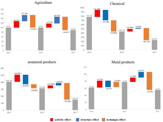 The technique effect on agriculture, chemical, and nonmetal products is pronounced (Figure 8). The contribution of the technique effect from agriculture to the reduction in embodied carbon emissions exceeded 50% in 2012–2015 and 2015–2017. The production side’s carbon emissions for the chemical and nonmetal product sectors show a downward trend over the past three years, and the technique effect is the biggest driving factor. The chemical sector reduced emissions by 2.84 million tons during 2015–2017, with a contribution rate of −65.13%, and nonmetal products reduced emissions by 2.38 million tons during 2015–2017, with a contribution rate of −76.2%. The contribution of the technique effect from metal products during 2012–2015 was 23.8%, indicating that this sector’s energy utilization rate and technological level were low during this period. The energy utilization rate and technological level improved during 2015–2017, reducing carbon emissions by 510,000 tons, with a contribution rate of −65.38%.
