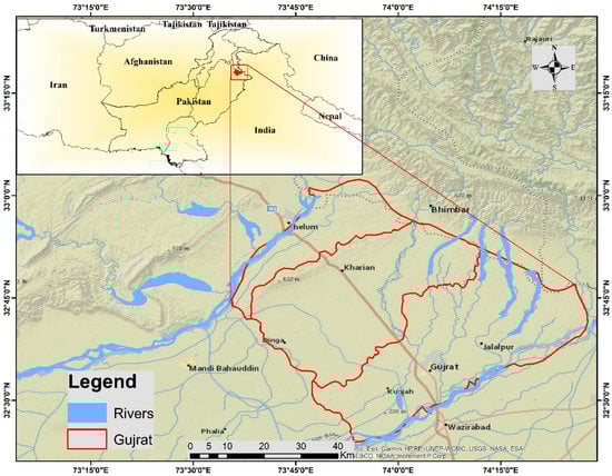 The Gujrat district in Punjab, Pakistan is situated to the northeastern part of Punjab at 32°34′23.7″ N latitude while 74°4′57.6″ E longitude and located in the mid of two major rivers, River Chenab toward Southeastern side and River Jhelum towards Northwestern side are flowing. It is bounded on the northeastern part with Azad Jammu and Kashmir, on the northwestern to Jhelum River which separates it from Jhelum district, towards the eastern and southeastern side linked by the Chenab River, dividing it from the districts of Sialkot and Gujranwala, and on the western side situated Mandi Bahauddin district (Figure 1).