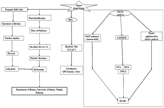 The collected phytosociological data for plants and environmental variables were organized and further processed in Microsoft Excel 2016 for subsequent analysis, following the CANOCO (version 4.5, Microcomputer Power, New York, NY, USA) and PAST software (version 4.10) [6,24]. The cluster analysis was based upon importance value index (IVI) of each wild grass species found in the 270 sampled spots. The optimal pruning fact for the dendrogram was determined using Ward’s technique and Euclidean distances. PAST software (version 4.07) was used to cluster and calculate the diversity indices for each cluster group. CANOCO software of applied to perform CCA and DCA [25,26]. On the basis of presence-absence (1/0) of species and Two way cluster analysis (TWCA) was completed. While complete procedure adopted for this study is given in the Figure 2.