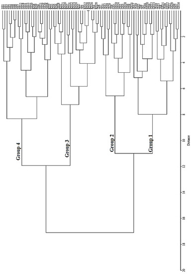Ward’s agglomerative cluster analysis classified the whole 90 transects from district Gujrat into four major groups (Figure 4). Cluster analysis (CA) established four groups of sampling transect in the studied area. Two way clustering analysis (TWCA) was done on the basis of the presence-absence (1/0) data of the species (McCune & Mefford, 1999) [27]. Species data matrix of 90 sampling transect cluster into four groups as shown in (Figure 5). Density, species richness, and diversity indices of four groups is given in Table 1 and in supplementary Table S1).