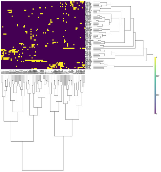Two-way cluster plot displaying distribution pattern of 57 grass species along 90 sampled transects. The yellow color representing presence whereas blue color donating absence whole of grass species.