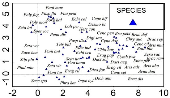 Edaphic along with environmental factors have considerable influence on species diversity, composition, and its dispersal [30,31]. Understanding the plant community’s response to abiotic factors is critical. The present study is the most complete examination of connection of species to environment in the Poaceae family [32], as it looks at vast geographic region in the Gujrat district. In the research area, a total of 57 species of wild grasses were explored. The floristic composition was comparable to that found in the Cholistan Desert [7,33]. In the current findings, the most specious genera were Eragrostis (5 sp., 18.5%) followed by Aristida Cenchrus (4 sp., 14.8%) and Panicum (2 sp., 7.4%). Similar results have also been reported from salt range of Pakistan previously as they reported 62 grass species belonging to 11 tribes Paniceae, Andropogoneae and Eragrastoideae being the dominants [34]. In our study, species like Brachiaria distachya, Cenchrus ciliaris, Digitaria nodosa, Pennisetum orienttale and Setaria glauca belongs to Panicoideae.