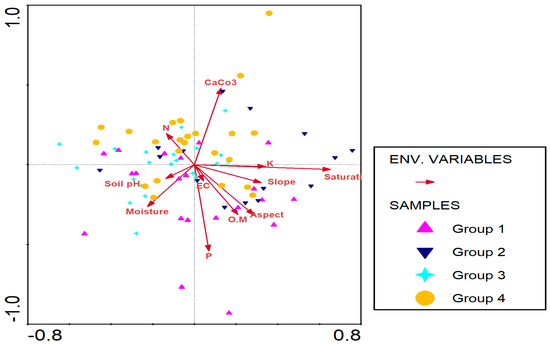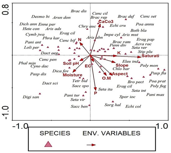 Ecological variables had a considerable influence upon community linkages, as explained by multivariate techniques (Cluster and Two-way cluster analysis, DCA, CCA) [51]. With the cumulative effect of ecological (slope, altitude, slope, aspect) and edaphic (soil saturation, soil moisture contents, pH, CaCO3, K, P, N, and organic matter) factors [18,52,53], the vegetation was divided into four plant associations using modern statistical tools. Floristic zonation has been linked to micro-topography, soil characteristics, altitude, and environmental gradients in general. Many researchers have identified similar classifications for Poaceae species found in various settings. Brazilian researchers [54] used similar methodologies to investigate classification and ordination of wild Poaceae family. Environmental aspects are correlated with the richness, quantity and functional features of wild grass species to determine for spatial arrangements of grasses plants. Wild grasses with various photosynthetic methods flourish in a wide range of climates. Several environmental characteristics displayed significant (p < 0.002) potential on vegetation, according to the ordination studies (CCA and DCA). Plant communities 1 and 2 have a strong relationship, for example, wild grasses such as Brachiaria ramosa and Dactyloctenium aegyptium in community-1. The distribution of these species seems to be strongly effected by soil moisture and CaCO3. Plant community 2nd presence of Dichanthium annulatum and Saccharum bengalense was most likely impacted by P, pH, and Ec. OM, altitude, N, and K were strongly correlated to Desmostachya bipinnata, Eleusine indica, and Echinochloa crus-galli. Environmental factors, as well as physical and functional features, have been linked to indicator species [39,53]. Ecological variables, according to the of the study [15], are central impact in determining the plant communities. The arrangement of plant species in communities can be attributed by topographical and ecological features. Every species has varied strategies in adapting to variable soil in community composition. Subsequently, soil factors are key markers and are critical drivers of species distribution within specific associations. The distribution of wild grass species is linked to soil structure, texture, soil moisture, availability of nutrients along with other environmental conditions.