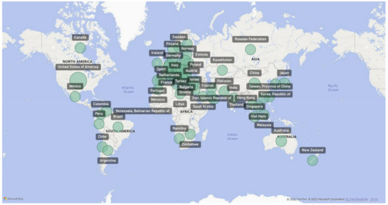 To illustrate each country’s research contribution and worldwide influence, we examined each country’s publication production through descriptive statistics values such as the publication’s sum of quantities, the sum of paper citations, the average number of paper citations, and the impact factor (IFs) [23]. All values correspond to the data included in the Microsoft Academic Graph, calculated as of 5 July 2021, including the sum of papers published, the number of papers cited, and the average number of papers cited. The quantity of citations in an article is often used to evaluate the influence of the academic study. The 2020 Journal Citation Reports of Clarivate Analytics were used to determine each journal’s impact factor.
