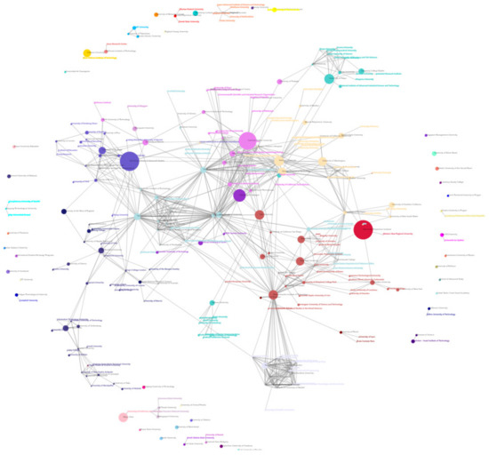 We used Microsoft Power BI’s Network Navigator Chart to visualize the network, which includes research that has been submitted by institutions. The node size is set according to the weighted number of papers published by each research institution as the primary reference, and the line between two research institutions represents the collaboration between them. The different colors represent collaborative clusters between different research institutions, while the same color represents more frequent and tighter collaborations. In the grouping process, research units that have published at least six papers are included in the calculation. After a preliminary screening of 554 research institutions, the remaining 306 research institutions are those that have published more than six papers. The samples were grouped into 57 groups through cluster analysis, and the final appearance is shown in Figure 5. Group 48 is the largest publishing group among all groups, with Johns Hopkins University, Technische Universität München, Heidelberg University, Imperial College London, and Harvard University as the core, and the color is PowderBlue. The second largest group is Group 23; this group is mainly composed of the National University of Distance Education, the Charles III University of Madrid, the University of Zaragoza, and the University of Applied Sciences Stuttgart; the color is Lavender.
