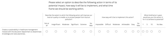 The survey included data capture for potential air quality actions identified from qualitative interviews in terms of predicted impact, perceived achievability and expected timeframe. Qualtrics, a web-based survey tool, was used to design and host the survey as shown by the sample question in Figure 1.