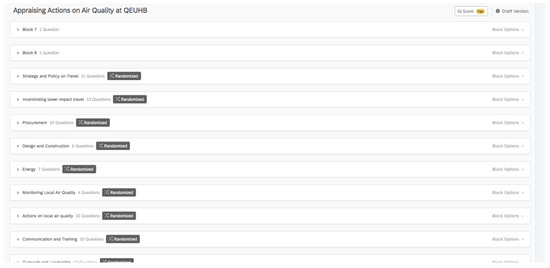 The blocks of questions in the survey. These were derived from thematic analysis of the interview data. The number of questions in each block is visible. These are the number of actions derived.