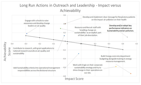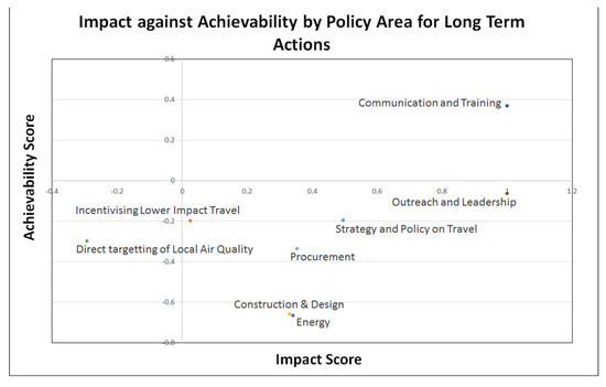Figure 4 shows that Communication and Training, and Outreach and Leadership are significant outliers in the long term. The rest of the policy areas in Figure 5 are not so significantly set apart. Strategy and Policy on Travel is the only other area that appears to offer some potentially high impact scores.