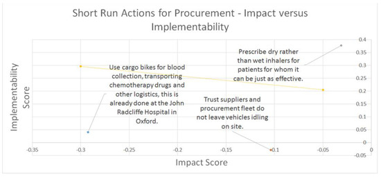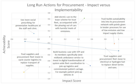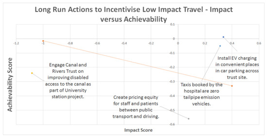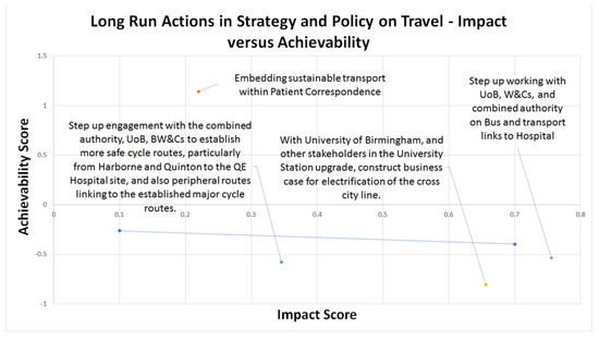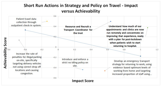 Two other actions were highly ranked across all short run actions. The first: ‘Developing an emergency transport strategy for returning to work [in the post-COVID-19 pandemic context], using evidence based optimum levels of working from home and targeting increased proportion of staff using sustainable transport (incl. buses and trains)’ was ranked third highest in terms of impact. This is already underway at the trust and will largely be dependent upon the first ranked action regarding the restructuring of patient activity and how much of this is required to be in person.