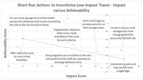 The action of: ‘Resource and Recruit a Transport Coordinator for the trust’ was ranked second highest for both impact alone and the average of impact and achievability. In the interviews it was made clear that resourcing new positions in the trust needs to add significant value to justify the cost. Participants suggest that transport was potentially a more tangible and focussed area for a job role than simply sustainability. Additionally, it was felt that positions and roles across the trust needed to appoint subject area experts and that sustainability in an organisation as complex as UHB would be too broad an area for a single role or even a small team to cover. Instead, targeting specific themes such as transport and energy which are key to the improvement of air quality and environmental sustainability would likely generate a more significant impact. There is evidence from [33], a study with interviews of 60 ‘mobility managers’ from Belgium, that a similar role as this action proposes, can effectively reduce use of single occupancy vehicles and move staff groups to lower impact travel choices.