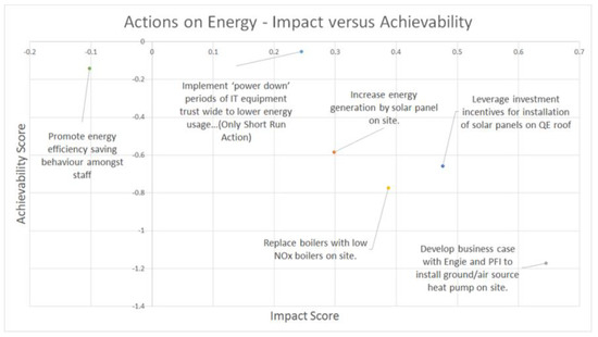 Figure 3 and Figure 4 both indicate that Energy, Construction and Design, and Direct Targeting of Local Air Quality are policy areas that are unlikely to offer actions with high impact for their achievability score because these areas would require large investments in infrastructure by the trust and alterations to the Private Finance Initiative (PFI) contracts in place at the Queen Elizabeth Hospital site. As a result, these barriers push down the achievability of any action in this space despite the chance that the impacts of such actions could be significant. This is the synthesis of discussion with many interview participants that also indicated these changes would be hard to bring about.