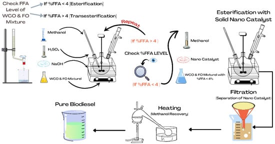 Hybrid oils containing excessively high free fatty acid content (% FFA > 4) has necessitated the use of a two-stage transesterification procedure. The low cost of methanol makes it the preferred alcohol for transesterification. In the first stage, 1 liter of hybrid oil, 6 mL of sulfuric acid (H2SO4), and 150 mL of methanol were used. The acid catalyst undergoes quick catalyst reaction to convert high FFA to methyl ester. The above mixture is agitated in the 3-neck flask at 60 °C, and after 1½ hour, a dark layer will appear at the top of the oil. The mixture is poured into the separating funnel and allowed at least three hours to settle. The acid layer can be black at the top of the oil. Drain the oil at the bottom of the separating funnel into a 3-neck flask and collect the top layer. Take the sample obtained oil from a 3-neck flask, and the measured FFA level is reduced to less than 4%. The steps employed to transform hybrid oil (WCO +WFO) into biodiesel is presented in Figure 2.