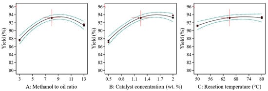- Figure 5c explains the interaction factor effects of reaction temperature and catalyst concentration tested for a fixed methanol-to-oil molar ratio equal to 8. The effect is seen to have a similar trend with more pronounced than the factors interaction of methanol-to-oil molar ratio and reaction temperature. The catalyst concentration up to the middle value of 1.25 wt.% increases the biodiesel yield and decreases later. Higher catalyst particles tend to accumulate and form a bulk mass, reducing the catalyst’s active surface area and increasing the mixture’s viscosity [81]. The effect of the reaction temperature is negligibly small compared to catalyst concentration. Increased values of reaction temperature decrease the biodiesel yield probably due to increased miscibility caused by a collision between the species; methanol vaporization ensures decreased availability of methanol in the reaction mixture. Similar observations are reported in the published literature [82].