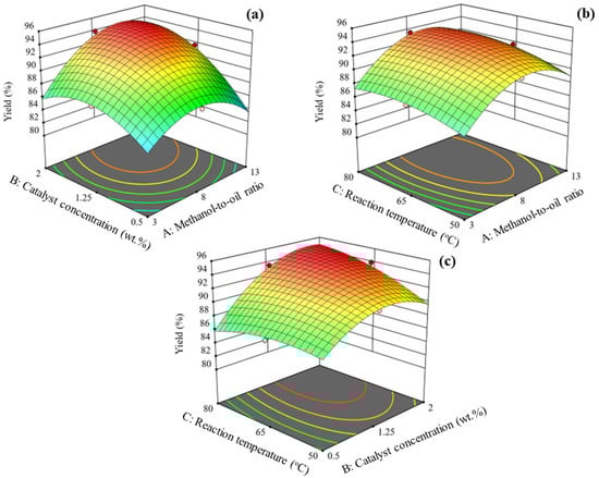- The biodiesel yield tends to improve with an increase in catalyst concentration and methanol-to-oil ratio up to the middle levels (refer to Figure 5a). The reaction temperature was kept fixed to 65 °C (the middle value of the operating range of RT) during the analysis. Catalyst concentration showed higher raise in biodiesel yield compared to the methanol-to-oil molar ratio. Increased concentration of MgO nanocatalyst increases the contact and availability of basic sites between catalyst and reactants, causing higher yield [77]. As the methanol-to-oil molar ratio was increased, the viscosity of the reaction mixture due to agitation involved in the transesterification process decreased (equilibrium shift towards the conversion side), resulting in increased biodiesel yield [24]. The combination of the highest catalyst concentration and methanol-to-oil ratio showed reduced biodiesel yield. The highest catalyst concentration with methanol to oil molar ratio could result in soap formation due to incomplete reaction. It is often difficult to separate the glycerol and biodiesel, resulting in reduced biodiesel yield [78].