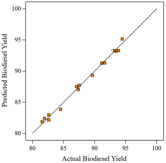 The model predicted, namely, full quadratic regression equation (i.e., Equation (10)), is tested for prediction accuracies and compared with experimental values (different settings of transesterification variables), resulting in best-fit data points close to the trend line (refer to Figure 6). The average absolute percent deviation in prediction considering all 17 experiments are found to be 0.3829. The full quadratic regression equation predicts the biodiesel yield accurately (with less percent error). Therefore, Equation (10) can be applied to search with different sets of transesterification variables to maximize biodiesel yield.